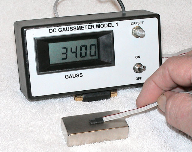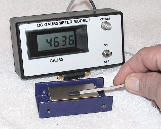 Any device that provides a "low reluctance return path" for the magnetic flux will see up to a 50% increase in field density. You can see this effect in these three photos. The bare N42 magnet only measures 3,400 Gauss with the Gaussmeter. This is 13,200Gauss magnet material yet it only reads 3,400 Gauss on it's surface. Remember, the flux density inside the pipe is always less than the material rating. Now notice what happens when we place this magnet in a steel channel and then in a complete heavy steel frame.