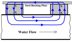In this configuration two magnets are mounted to a steel back plate with magnetic poles as shown. This magnet configuration produces magnetic flux lines that are oriented in the same direction as the water flow. This design produces uneven flux density across the section of the pipe and it is concentrated where the magnets are closes to one another. It does provide a low reluctance return path for the magnetic flux through the steel plate. |